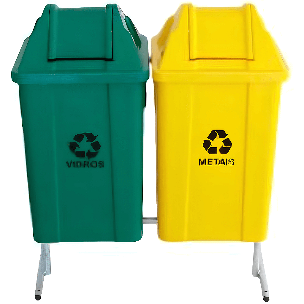 O conjunto para coleta seletiva com 2 lixeiras de 60 litros é de alta qualidade e resistência, com estrutura metálica de aço carbono, resistente a impactos, raios UV e lavagens frequentes. É indicado para indústrias, condomínios, shoppings.